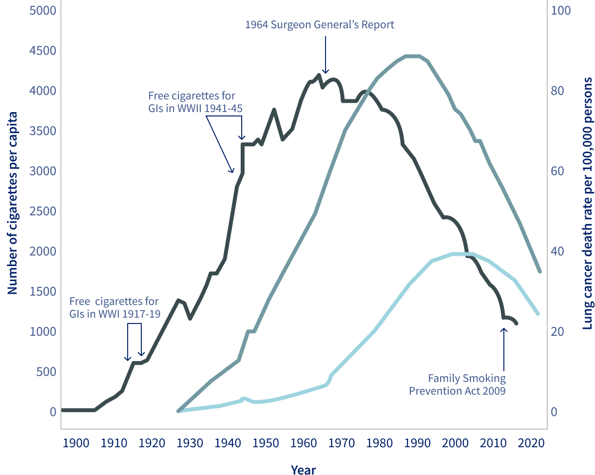 “Lung cancer mortality rates rose from three to four per 100,000 people in 1930 to 91 per 100,000 men in 1990 and 42 per 100,000 women in 2002 before declining by 58% to 38 per 100,000 in men and by 36% to 27 per 100,000 in women in 2020. Reductions in mortality began several decades after the release of the first US Surgeon General’s Report on Smoking and Health in 1964 that motivated people to quit in large numbers. The pace of the mortality decline has closely mirrored that for incidence until the most recent 5‐year period, when the decrease in mortality accelerated, in part because of recent advances in treatment and early detection. From 2016 to 2020, the lung cancer death rate declined by 4%–5% versus 1%–3% per year during 2015–2019 for incidence among both men and women.”