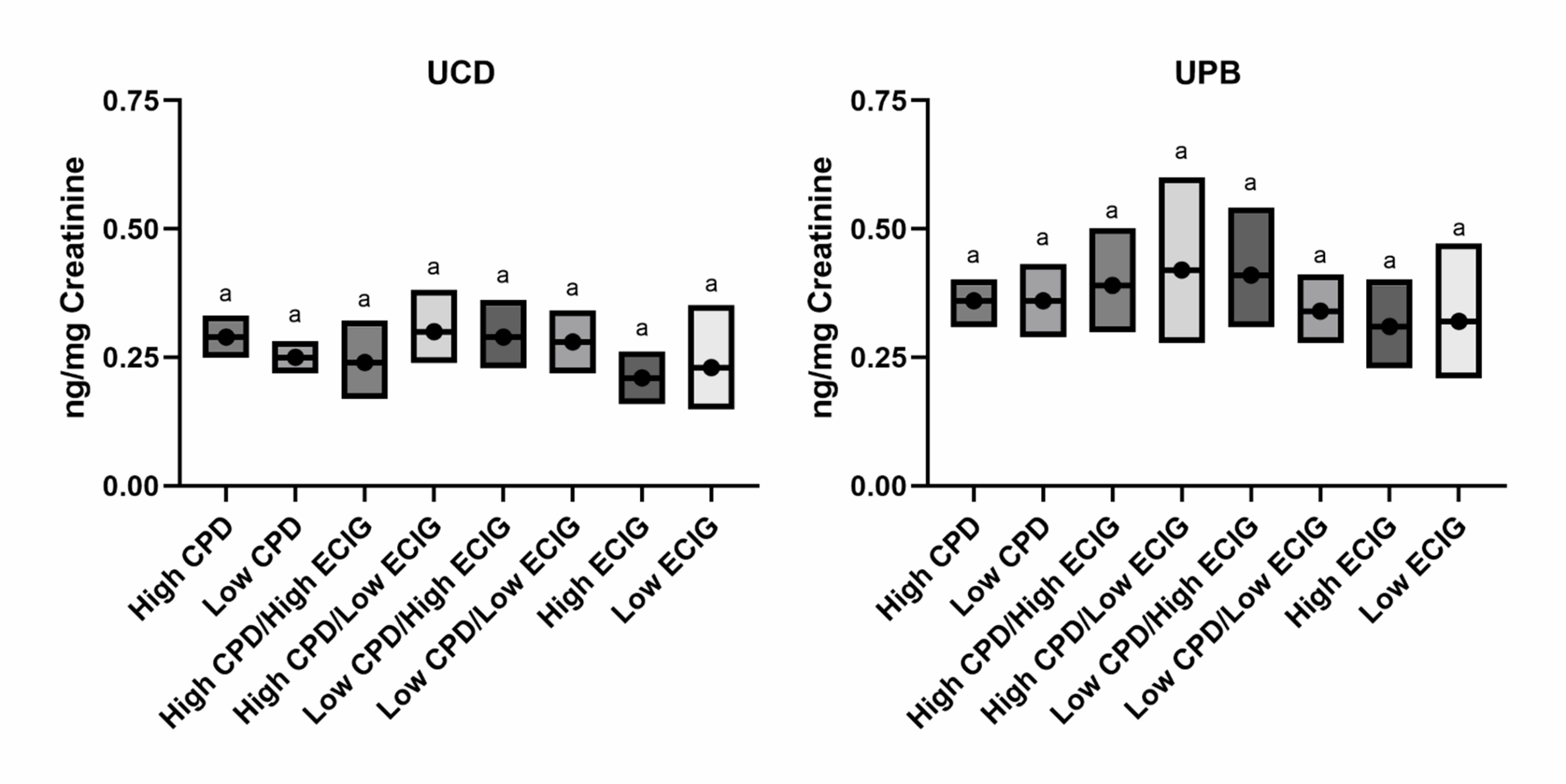 Exposure to heavy metals is measured by urinary Cadmium (UCD) and Lead (UPB). CPD = Number of cigarettes smoked per day and ECIGS = Frequency of e-cigarette use per day. The bars represent adjusted geometric means and boxes represent the 95% confidence intervals of biomarkers of exposure based on weighted multivariate regression analysis. Shared letters indicate no statistically significant difference between groups (e.g., groups sharing “a” denotes no significant difference between groups; groups with different letters, “a” and “b,” denotes a significant difference between groups). ng/mg creatinine = nanograms per milligram, normalized for creatinine.