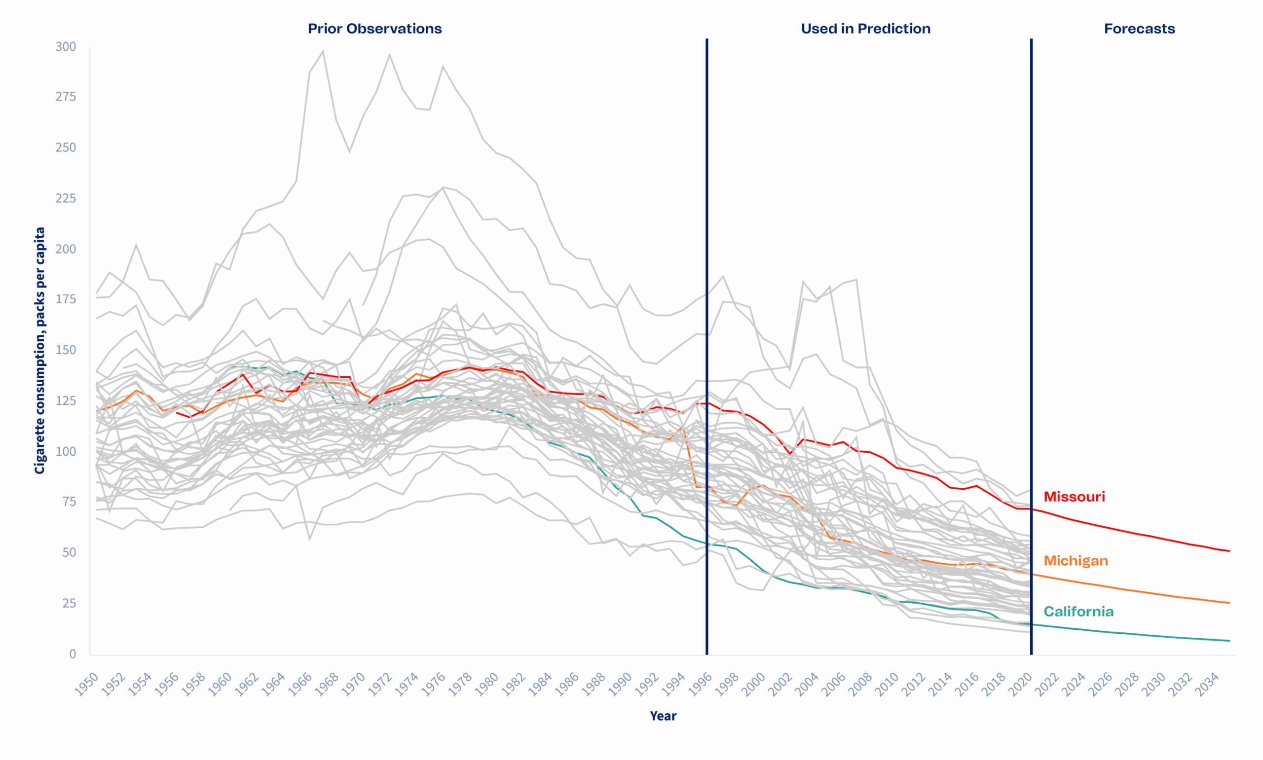 Though decreasing overall, forecasts of cigarette consumption show Missouri and Michigan (among other states) may not meet public health targets by 2035.